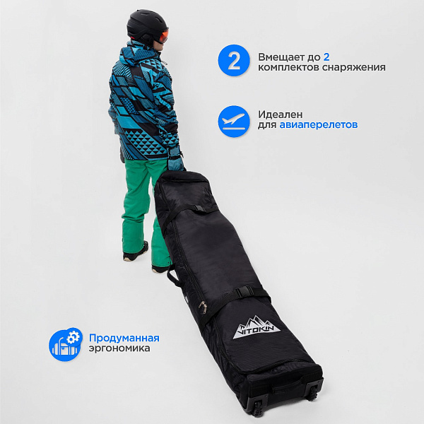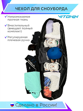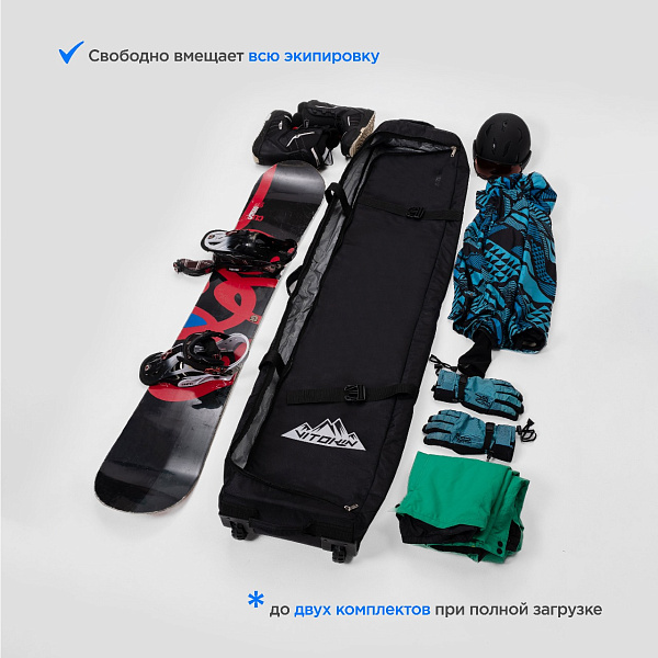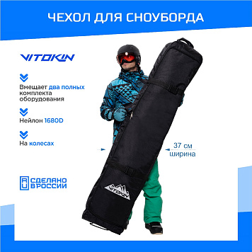 Чехол для сноуборда на колесах VITOKIN для транспортировки и хранения. В чехол легко помещается два комплекта: сноуборд с креплениями, ботинки, одежда для катания и необходимые мелочи.