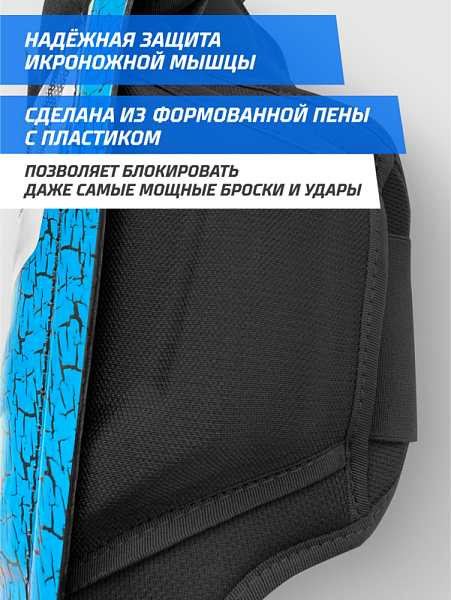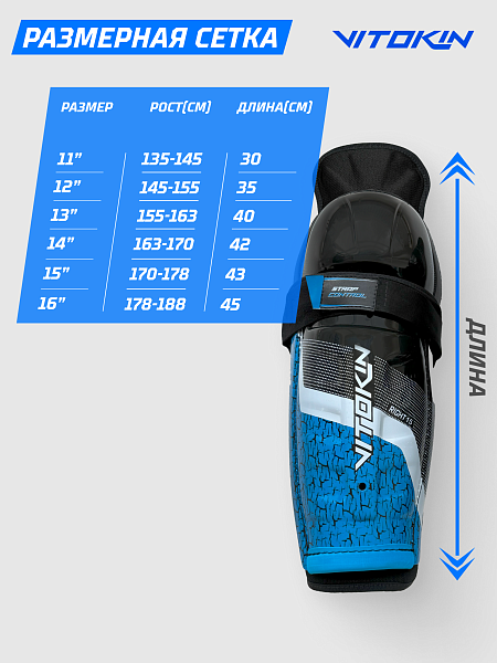 - Защита голени изготовлено из прочного пластика с рёбрами жёсткости выдерживает самые мощные броски и силовые столкновения. На голени нанесены указатели размера щитка в дюймах и пометка, для какой ноги — правой или левой.