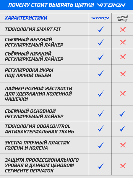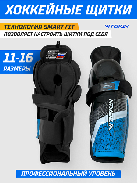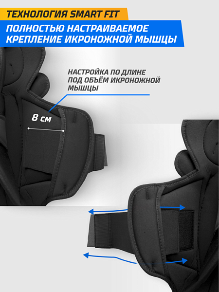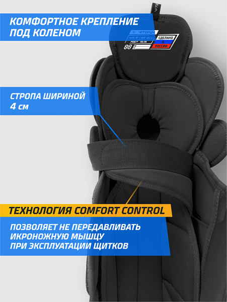 Крепления заслуживают отдельного внимания. В области икры работает система SMART FIT, позволяющая отрегулировать натяжение под любую форму ноги; в коленной зоне применяется технология COMFORT CONTROL — мягкая эластичная стропа с нано‑липучками надёжно фиксирует щиток, не пережимая ногу. Вес щитков оптимален для игрового уровня, баланс между мобильностью и защитой чувствуется с первых секунд на льду.