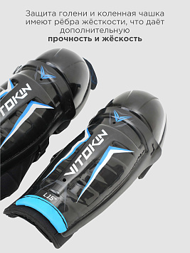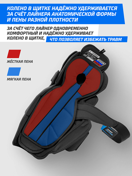 - Икры закрывает формованный сэндвич из пластика и EVA‑пены высокой и средней плотности, который обеспечивает комфортное и плотное прилегание, отлично рассеивая энергию удара.