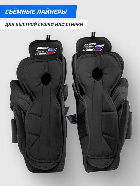 Лайнер имеет анатомическую форму и регулируется под игрока с помощью нано‑липучек; в коленной зоне расположены плотные вставки, удерживающие сустав в чашечке при ударах. Лайнер съёмный — его удобно снять, быстро просушить или постирать. Ткань обработана OdorControl: антибактериальная пропитка помогает оставаться свежими и не вызывать неприятный запах даже после тяжёлых матчей.