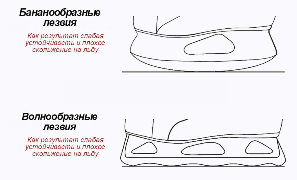Основная проблема во многих коньках — это неправильный профиль лезвия. Большинство коньков точат на ручных станках. Каким бы опытным не был мастер, в любом случае такая заточка приводит к образованию бананообразного или волнообразного профиля. В результате чего сцепление и баланс на льду значительно ухудшается.