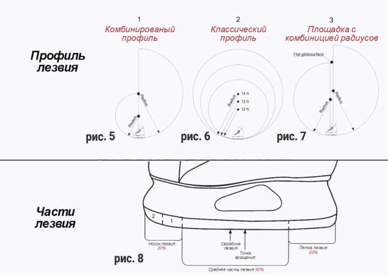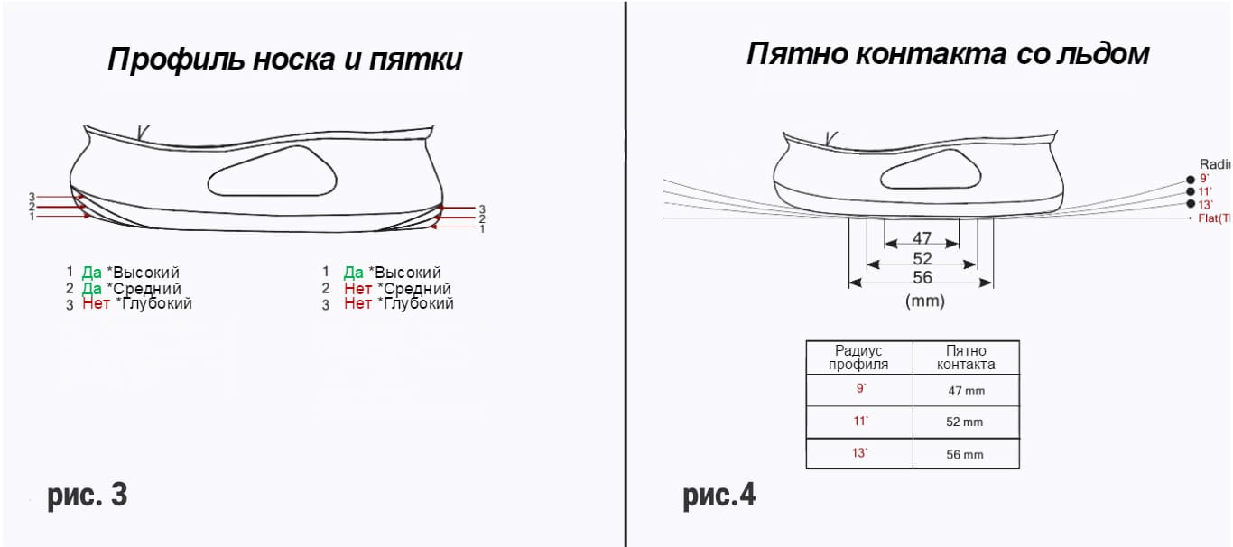 Профиль лезвия следует выбирать индивидуально, основываясь на Ваш вес и стиль катания. Чем больше ваш вес, тем больше контур лезвия должен соприкасаться со льдом для того, чтобы равномерно распространять ваш вес. Современный высокий уровень катания требует увеличения маневренности, быстрых стартов, более быстрого перекрестного катания, вращения и тд. Более большой радиус контура лезвия (где большая часть лезвия соприкасается со льдом) помогает катающемуся обеспечивать лучшую стабильность и баланс, меньшее трение и более высокую скорость. С другой стороны, это снижает способность делать быстрые повороты. В свою очередь маленький радиус профиля улучшает маневренность, но при этом снижает устойчивость игрока. Ваша задача найти баланс между устойчивостью на льду и маневренностью с помощью нужного профиля лезвия.