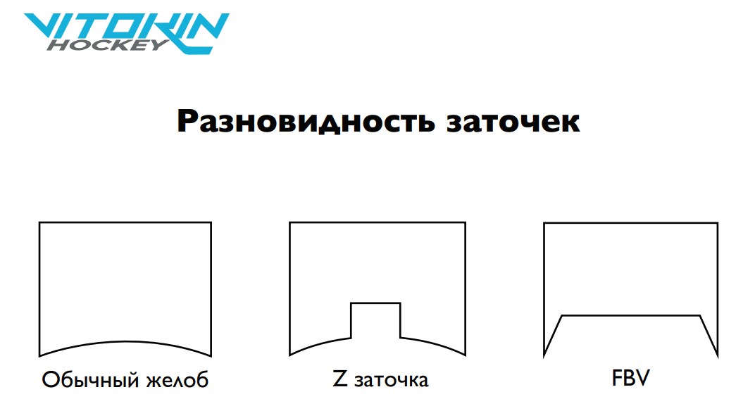 · Flat заточка — заточка в плоскость. Сейчас уже не используется в обычном хоккее, а применяется только для русского хоккея (Bandy).